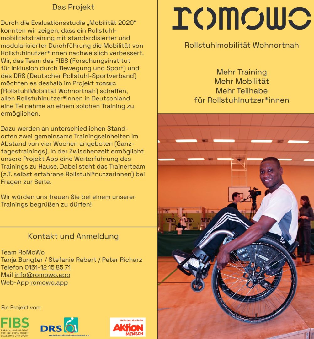 Kostenloses Mobilitätstraining im Umgang mit dem Rollstuhl. Das Forschungsinstitut für Inklusion durch Bewegung und Sport (FIBS) und der Deutsche Rollstuhl-Sportverband (DRS e.V.) möchten, gefördert durch die Aktion Mensch, im neuen Projekt RoMoWo (RollstuhlMobilität Wohnortnah) bis März 2027 Strukturen für ein nachhaltiges bundesweites Mobilitätstraining für Rollstuhlfahrer*innen aufbauen. Was ist RoMoWo?RoMoWo – RollstuhlMobilitätWohnortnah ist ein bundesweites Projekt, das Rollstuhlnutzer*innen durch gezielte…